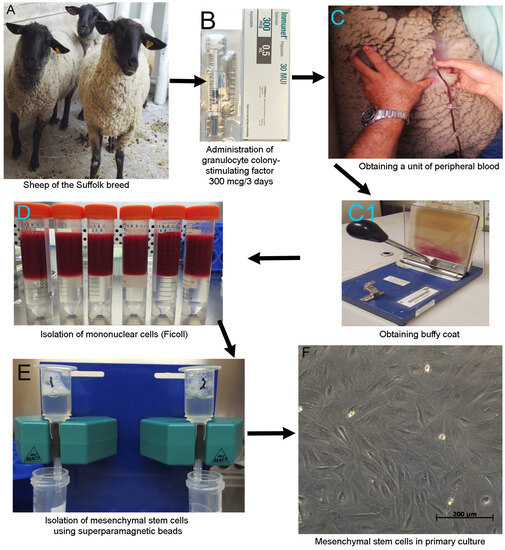 Processing of the samples. (A) Animal model: three sheep of the Suffolk breed. (B) The animals received a daily G-CSF subcutaneous dose of 300 mcg for three days. (C) We obtained 450 mL of peripheral blood from the jugular vein using a bag for blood sample collection in animal-handling facilities. The sampling was performed by a veterinarian. (C1) Blood unit was separated from the leukocyte fraction “buffy coat”. (D) We used discontinuous density gradient centrifugation to isolate the mononuclear cells (Ficoll). (E) Isolation of mesenchymal stem cells using superparamagnetic beads via negative selection. (F) MSC in primary culture.