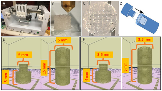 Scaffolding 3D printing. (A) REGEMAT 3D Bioprinting system (University of Granada, Spain). (B) Side view of the printing process. (C) Scaffolding top view. (D) Outline of the implant assembly. (E) Model for lateral implant. (F) Model for external and inside joint implants.