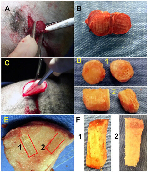 Removal of implants. (A) Removal of the lateral implant after three months. (B) View of the lateral implant after removal from the thoracic ribs. (C) Removal of the lateral implant placed in the joint capsule for six months. (D) (1) In the image, you can see the two sections of the implant placed in the joint capsule; in this case, the scaffolds without cells. (2) To the left, we present the section of the implant seeded with pre-differentiated MSCs, and to the right, we present the section with the MSCs pre-differentiated to cartilage. (E) Lateral view of the implants within the joint after six months. (F) (1) View of the implant placed as a control without cells. (2) We can see the implant with differentiated MSCS to cartilage (upper) and bone (lower); it can be seen that the two sections of the implant are completely fused.
