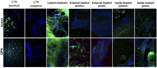 Analysis of the expression of markers for bone in the implants at three and six months. First, we can observe that for the 3-month implantation with MSCs pre-differentiated into osteoblasts, the expression of bone markers (OPN and RUNX2) remained similar to those of the positive control obtained from healthy bone (Control +). On the other hand, for the external joint implants without cells at six months, we observed that expression of the markers for bone was decreased concerning the control (Implant vs. Control), which indicates little colonization of the cells adjacent to the implant. Contrastingly, external joint implants with pre-differentiated cells demonstrated an increase in markers for bone, implants inside joint without cells at six months behaved similarly to their non-joint counterparts’ and finally, implants inside joint with MSCs pre-differentiated demonstrated a significant increase for bone markers analyzed.