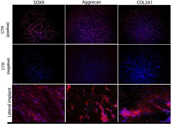 Characterization via immunofluorescence of lateral implant after three months. The nuclei of each cell appear in blue (stained with 4′6-diamidino-2-phenylidole (DAPI); magenta markings indicate positivity for different cartilage markers (COL2A1, Aggrecan, and SOX9).