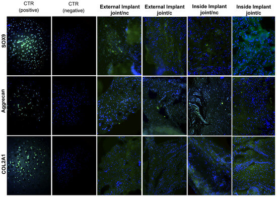 Characterization via immunofluorescence of external and internal implants after six months. The nuclei of each cell appear in blue (DAPI), and green markings indicate positivity for different cartilage markers (COL2A1, Aggrecan, and SOX9). The positive markers are labeled in green with fluorescein isothiocyanate (FITC). c. Implant with pre-differentiated MSCs. nc. Implant without pre-differentiated MSCs.