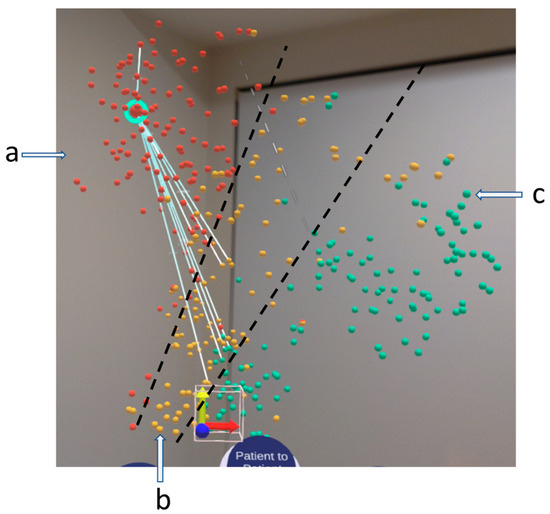 VROOM, our immersive visualisation in an AR headset. It shows a 3D similarity space of patient cohorts. In this case, the OHSC three-risk data set is used. The red, yellow, and cyan indicate the patient risk factors, high, medium, and low risk, respectively, labelled by a, b, c. The white line connecting the selected patient, which has a blue hue, to the rest of its neighbours is determined by game theory using the method discussed in Section 3. The black line indicates the separation of the clusters.