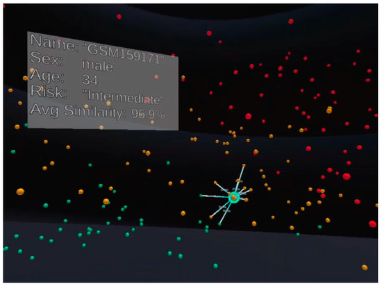 VROOM has been implemented in both AR and VR; in this figure, the visualisation is run in VR. Everything is similar to Figure 1, except the neighbours for the selected patient here are determined by their distance from the patient using Euclidean distance in the 3D Cartesian coordinate space.