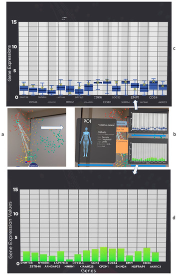 From overview visualisation as shown in Figure 1 or Figure 2, the analyst can select a patient of interest (hereafter referred to as POI) to conduct detailed studies. As shown in Figure 3a, the analyst selects the patient using the select command by gazing and air-clicking on the patient. The analysts can grab the sphere representing the patient and put it onto the virtual tablet shown in Figure 3b. The virtual tablet shows the metadata of the patient, such as age, gender, and ethnicity. It also provides statistical information such as boxplots and bar charts. The boxplot (Figure 3c) shows the patient gene value compared to the sample population of the currently displayed data, which is helpful to indicate if the POI gene value is an outlier or within the interquartile range (IQR). At the same time, the bar chart displays the value of each of the 17 genes. These tools provide an overview and detailed visual analytics capabilities to the analyst. As this feature only deals with the POI, there are no differences between the two systems.