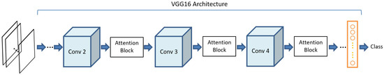 To boost robustness and guide the models’ decision making during training, attention modules were added throughout the architecture. In this study, the integration strategy of [5] was adopted for all the proposed attention modules of AGFER, SEFER, and CBAMFER. They are placed after the second, third, and fourth convolutional blocks prior to the last pooling operation of each of the blocks. Following the work of [36], the last pooling layer (“pool5”) was also removed from the architecture to increase the spatial dimension for better classification results and assessment of the decision visualization. This impact can be seen in the ablation study performed in Section 5.1, which assesses change in performance when specific parts of the CNN are removed. Figure 1 represents the network architecture and the implementation of the attention block strategy.