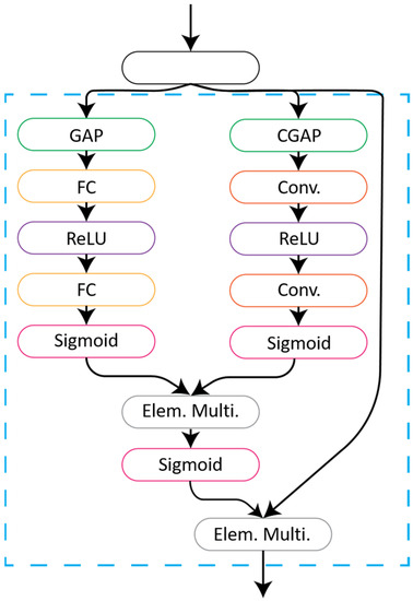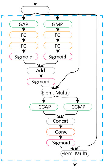 In this study’s approach, some modification to the main CBAM architecture was performed. The weights of the MLP were not shared between the FC layers but rather followed the same approach of the SE block, i.e., a sequential approach. This approach was taken for the FC layers so that they could learn independently from each other for a better representation. Figure 3 represents a schematic drawing of the CBAM block used in this study.