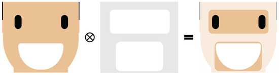 To boost the model’s classification performance and its focus on regions of impact for emotion recognition, a guidance strategy was adopted. First, a binary mask representing facial areas of special interest was created. This mask was used only during the training stage, where the input was fused with the mask and specific weighting for the model to focus on these areas and thus reduce the influence of the rest. Equation (1) represents the mask–image fusion and the output from the model input layer. is the image input, is the binary mask, and is the weighted parameter, set to = 0.125 in this study. Figure 5 provides a graphical illustration of the mask–image fusion.