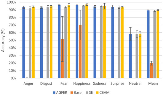 Figure 7 shows that the attention-integrated models significantly outperformed the base model. The neutral class showed the weakest performance in the attention-guided networks with a mean of 58.32%, 57.95%, and 58.53% for each of the AGFER, SEFER, and CBAMFER models, respectively, while the remaining emotion classes had greater than 90% classification accuracy. The proposed AGFER model had a mean accuracy of 89.19% ± 0.75, matching the performance of the SEFER and CBAMFER models with 88.73% ± 0.91 and 89.77% ± 0.70, respectively. The base model’s low performance was recorded with a mean of 19.76% ± 2.49 over all emotion classes and the five segments.