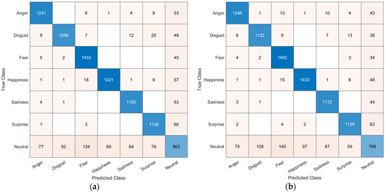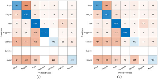 Confusion matrix results from the five segments for the OULU-CASIA validation set on the (a) AGFER model and (b) CBAMFER model. Blank boxes are equivalent to 0 or no predictions.