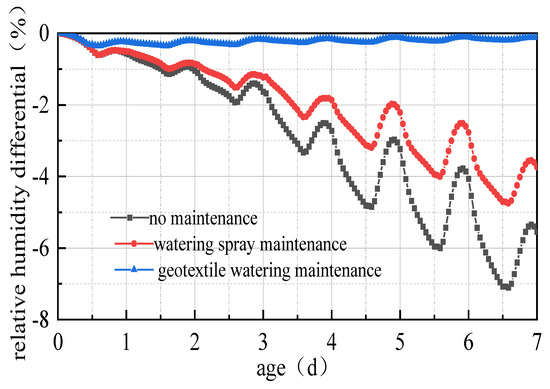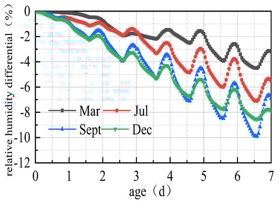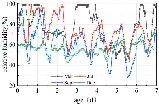 As shown in Figure 10 and Figure 11, the construction month significantly impacted the humidity and humidity difference of the top surface of the panel. On the panel surface of a 7-day age period, the relative humidity in March and December was 97% and 92%; the humidity difference in March and December was 3% and 8%, respectively.