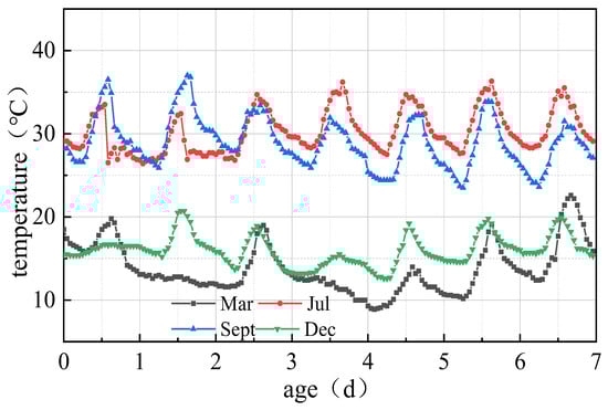 The ambient temperature and humidity exhibited diurnal variations, with differences in the magnitude and pattern of change. In March and December, the temperature varied by 10 °C to 20 °C with fluctuations during the day. In December, the temperature was generally higher than in March. In contrast, the temperature variation in July and September was relatively high, ranging from 25 °C to 35 °C, with July generally hotter than September. The humidity also varied with diurnal changes, but the amplitude of variation was different. In March and July, the humidity ranged from 50% to 100%, with more fluctuations during periods of high humidity. In contrast, when the weather was clearer in September and December, the humidity varied from 42% to 98%, with fewer fluctuations in periods of high humidity.
