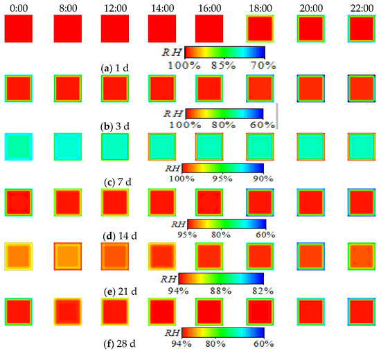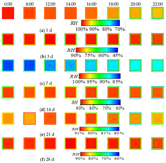 As shown in Figure 18, Figure 19, Figure 20 and Figure 21, the paving time had a significant impact on the humidity field of the panel during its early age period within the first 24 h, and the extent of the influence gradually decreased with age, mainly due to the following characteristics: