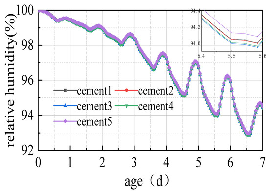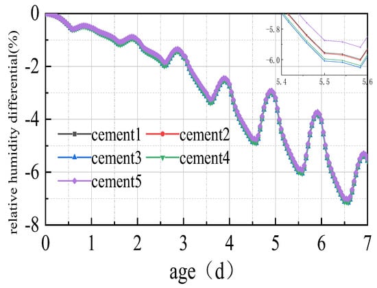 It is well-established that different types of cement generate various amounts of heat during the hydration reaction, which affects the internal temperature of the panel and, thus, the humidity field inside the panel. This article selects five different types of Portland cement to analyze their impact on the humidity of cement concrete pavement panels. The cement components are shown in Table 2. Except for cement, all other materials, water-cement ratio, sand rate, etc., are the same in the concrete configuration. The silicate cement with different clinker fractions on the relative humidity at the top of concrete pavement panels and the difference in humidity at the top and bottom of panels , as shown in Figure 8 and Figure 9. Table 2 shows the composition of the cement clinker.