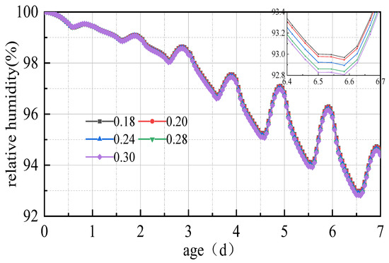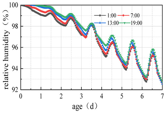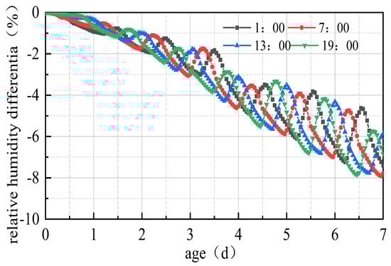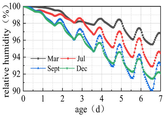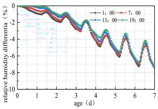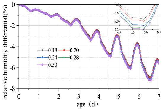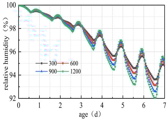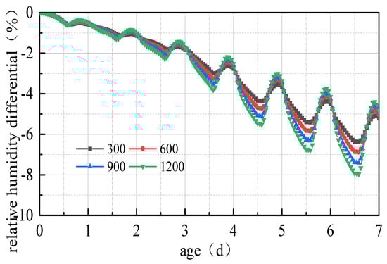 We adopted the environmental data from Fuzhou in July for the benchmark working conditions. This data showed fluctuations with age and was able to rapidly exchange humidity with the concrete on the top surface of the panel. As a result, the temperature and humidity at the top of the panel varied greatly, leading to a smaller difference in hydration heat produced by the type of cement in the range of the top of the panel and a smaller humidity difference Δh.