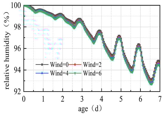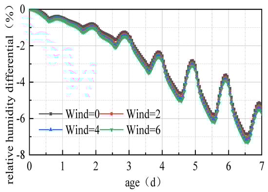 Figure 12 and Figure 13 show the effect of wind speed on the relative humidity h and humidity difference h at the top of the concrete pavement panel. Although higher wind speeds resulted in a faster drop in concrete humidity; their effect on the panel’s overall humidity and humidity difference was not significant. In this respect, the difference between the drop amplitude of panel humidity and the humidity difference amplitude under the influence of different wind speeds was less than 1%.