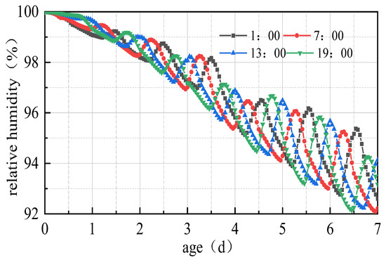 At 7:00, the hydration reaction and the environmental factors almost reached their strongest state, resulting in a coupling effect that caused the panel humidity to drop faster and peak at a higher level. At 19:00, the temperature and solar radiation were lower than during the daytime, and the panel moisture evaporation rate and humidity dropped slowly. At 13:00, the panel poured was only partly exposed to direct sunlight, resulting in a lower moisture evaporation rate than at 7:00 but higher than at 19:00. Finally, panels poured at 1:00 experienced no solar radiation and lower temperatures, resulting in the lowest moisture evaporation rate.