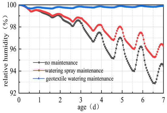 The humidity level of the concrete pavement panel subjected to geotextile sprinkler curing almost reached saturation (RH = 100%) on the surface of the panel surface during the curing period, and the humidity difference was less than 1%.