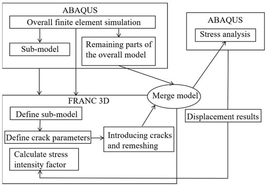 FRANC 3D 7.5.5 version is a software specifically designed for analyzing crack growth, which simplifies some of the tedious steps of crack growth compared to non-professional software such as ABAQUS (2020 version) and ANSYS. However, due to the inability of FRANC 3D to perform model preprocessing work, it is necessary to combine ABAQUS and other finite element software when analyzing cracks using FRANC 3D. FRANC 3D uses the M-integral method to solve the stress intensity factor. Its mathematical expression is similar to the J-integral, but it can consider the influence of temperature, crack surface contact, crack surface traction, residual stress, etc., on the stress intensity factor. When analyzing cracks in FRANC 3D, the front edge of the crack is divided into unit ring grids to refine the grid, thereby reducing calculation errors and improving the accuracy of the calculation results. Refs. [,,,] compared the calculation results of FRANC 3D with the standard formula, and the validation results showed that FRANC 3D has high accuracy. The interaction process between FRANC 3D and ABAQUS is shown in Figure 1.