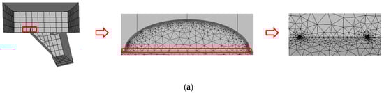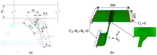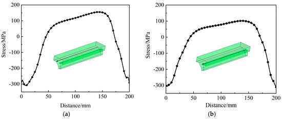 The orthotropic steel bridge deck and U-ribs are connected by welding. During the welding process, uneven temperature fields, local restrained expansion and contraction, and local plastic deformation may occur. The enclosed colder material will suppress the shrinkage of the heating material, resulting in residual tensile stress near the weld seam. Higher residual tensile stress will accelerate the growth of fatigue cracks [,,]. Following are directions for preparing the model. Select a half U-shaped rib with a transverse direction of 300 mm and a longitudinal direction of 200 mm for simulation of welding residual stress and divide the weld area into a 1 mm refined grid. The surrounding area adopts a 4 mm grid, and a 2 mm transition element is used between the two. Apply a symmetric constraint in the z-direction at the symmetrical centerline of the deck and U-rib, which constrains the translation in the z-direction and the rotation in the x and y directions. On the other side of the bottom surface of the deck, constrain the translation in the y direction, as shown in Figure 5b.