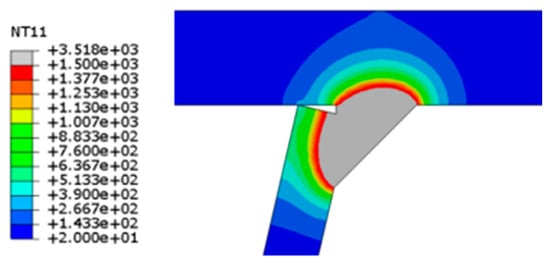 The welding simulation process involves complex material nonlinear problems, and the calculation requires defining the physical and thermodynamic parameters of the material at different temperatures. Due to the incomplete thermophysical parameters of steel materials at present, the temperature-dependent curve of Q345 steel material parameters was obtained from references [,], and the radiation Stephen Boltzmann constant was taken as 5.67 × 10−8 W/(m2·°C4) according to references []; the convection heat transfer coefficient is 13 W/(m2·K); absolute zero is −273.15 °C. The finite element analysis of welding residual stress is carried out using the sequential thermal coupling method, and the welding heat input process is simulated using the “life and death element” method to simulate the weld filling method. According to the boundary criterion of the welding pool, the isothermal surface is formed by taking the steel melting point of 1500 °C as the boundary, and the temperature equal to the melting point temperature forms the contour of the welding pool. The gray area is the area above the melting point, as shown in Figure 6. The shape of the welding pool is relatively close to the actual weld dimensions (Figure 5a), indicating that the selection of heat source model parameters is reasonable.