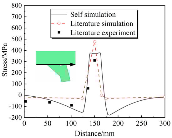 The transverse residual stress is caused by the uneven transverse temperature distribution during welding, which causes the material to expand and contract transversely. The results are shown in Figure 7. The transverse residual stress along the direction of the weld seam is shown in Figure 8, with compressive stress in the arc initiation and arc extinction zones and relatively stable tensile stress in the stable zone of the middle weld. Comparing the finite element analysis and experimental results of transverse residual stress at the intermediate weld seam in reference [] with the simulation results in this paper, as shown in Figure 9, it was found that the simulation results in this paper are relatively consistent, indicating that the simulation of residual stress is reasonable. The welding toe and root at the connection between the orthotropic steel bridge deck and the U-rib are the locations where fatigue cracks are prone to initiate and develop along the direction of the weld seam. The transverse welding residual stress perpendicular to the weld seam direction is the most unfavorable among the residual stresses, which will accelerate the propagation of fatigue cracks. The transverse residual stress along the plate thickness direction at the welding toe and root at the middle welding stable positioning position x = 100 mm is shown in Figure 10, showing a tensile–compression–tensile distribution pattern.