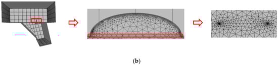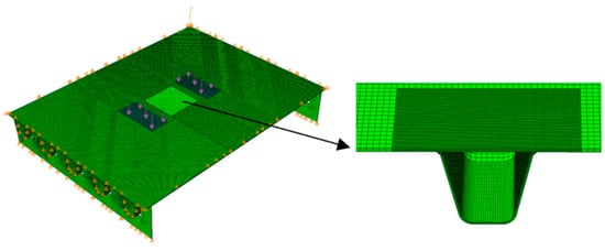 The most unfavorable load loading positions for the weld details were obtained from Section 2.2. For each span of the orthotropic steel bridge deck, when the vehicle is in the middle of each span, cracks at the weld details of the U-rib and deck in the middle of the span will be more likely to propagate. Therefore, a reinforcement model was established based on the most dangerous load location. In order to simplify the calculation and ensure that the orthotropic steel bridge deck has significant local effects under vehicle loads, a local model with five U-ribs in the transverse direction and a single span in the longitudinal direction was selected for reinforcement analysis. And the vertical displacement of the diaphragm is constrained, the lateral displacement of the two sides of the deck is constrained, and the longitudinal displacement of the cross sections at both ends of the U-rib and the deck is constrained. The grid refinement is made for the focus area of the middle weld, as shown in Figure 11.