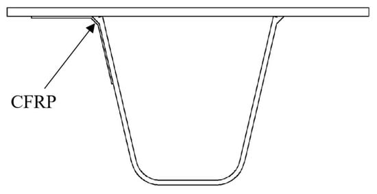 The key to the reinforcement of the fatigue cracks at the welding connection between the deck and the U-rib is to reduce stress concentration and improve the stress state of local cracks. This study adopts the method of pasting a CFRP sheet on the lower surface of the deck for the fatigue cracks at the welding details of the longitudinal ribs and the deck, as shown in Figure 12. The material characteristics of the CFRP sheet with a thickness of 0.167 mm are shown in Table 1. The CFRP and steel bridge surfaces are connected using a non-thickness cohesive force contact method, which does not require any presetting of the adhesive layer. When establishing the reinforcement model of the deck and the U-rib weld, only the steel bridge and CFRP composite material need to be established, and the bond-slip does not need to be considered.