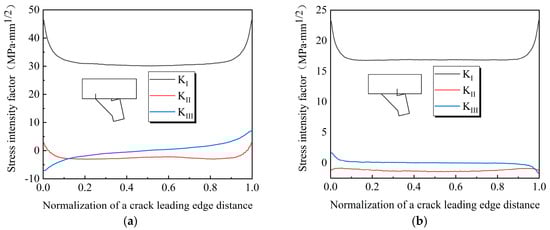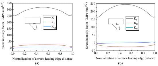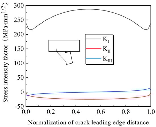 When the vehicle is applied at the most unfavorable load position, the stress intensity factor of the weld toe crack at the midspan weld detail is shown in Figure 14. When the amplitude of the stress intensity factor is less than the threshold value of the stress intensity factor, the crack will not expand. Referring to BS 7608:1993, the threshold value of the stress intensity factor Kth = 63 MPa·mm1/2. Only under the action of vehicle load is the maximum value of KI at the weld toe 46 MPa·mm1/2, and the maximum value of KI at the weld root is 23 MPa·mm1/2, which is obviously less than the threshold value. Therefore, considering only the effect of the vehicle, theoretically, the crack at this location does not have the ability to propagate. It can be seen from the distribution of the stress intensity factor that the crack here is a mixed mode fatigue crack dominated by mode I.