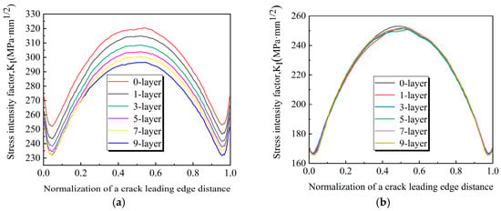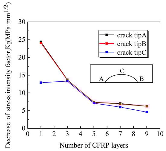 Figure 18 shows the decreasing amplitude of stress intensity factor KI of cracks between adjacent layers of CFRP. The decreasing amplitude is large before the fifth layer and decreases after the fifth layer. From the first layer to the fifth layer, the decrease in KI was 24 MPa·mm1/2, 14 MPa·mm1/2, and 7 MPa·mm1/2, respectively. When CFRP increased to the seventh and ninth layers, the decrease in KI was 7 MPa·mm1/2 and 6 MPa·mm1/2, respectively. When the number of CFRP layers exceeds five, the reinforcement effect on cracks decreases.