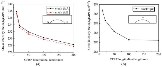 Relationship between weld toe crack KI and CFRP length. (a) Crack tip A and B; (b) crack tip C.