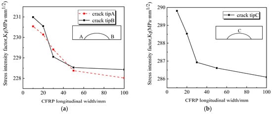 Relationship between weld toe crack KI and CFRP width. (a) Crack tip A and B; (b) crack tip C.