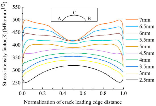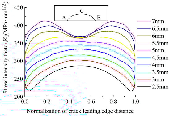 Figure 22 shows the change of the stress intensity factor value KI of the crack face when the weld toe crack starts from the initial depth of 2.5 mm and gradually expands to 7 mm depth. The distribution of KI gradually changes from small on both sides and large in the middle to large on both sides and small in the middle. The KI at both ends A and B of the crack always shows an increasing trend with increasing depth, while the KI at the middle C of the crack shows a first increasing and then decreasing trend with increasing depth. This is due to the difference in the distribution of transverse residual stress on the plate thickness. The residual tensile stress is high near the surface, and as the depth increases, the residual stress changes from tensile to compressive, slowing down the cracking of cracks.
