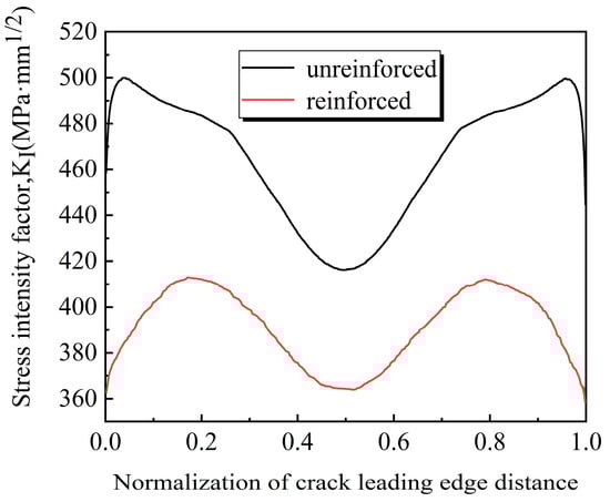 In Figure 17, it can be seen that the KI of the crack at the weld toe decreases with the increase of the number of CFRP layers, while the KI of the crack at the weld root does not change significantly with the increase of the number of CFRP layers. This is because CFRP is attached to the surface of the crack at the weld toe. When the crack surface is subjected to tensile stress, CFRP can limit the growth of the weld toe crack, while the crack at the weld root is not in contact with CFRP and is far away, thereby unable to play a reinforcing role. Therefore, the following text will only conduct reinforcement research on cracks at the weld toe.