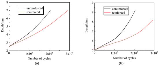 Relationship between cyclic load and crack growth of weld toe before and after reinforcement. (a) Depth; (b) length.