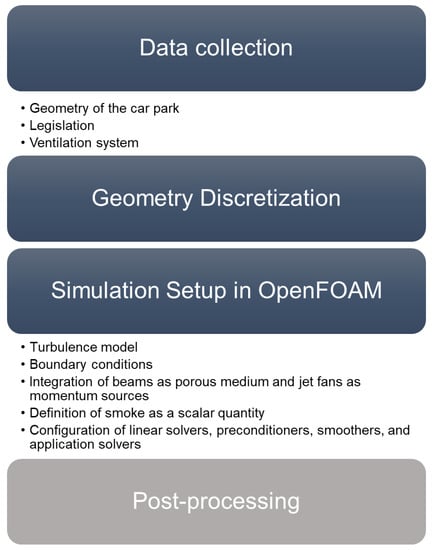 The design complexity of jet fan ventilation systems necessitates the use of computational fluid dynamics (CFD) to model airflow within the car park and ensure optimal design effectiveness. CFD simulations provide a sophisticated and comprehensive tool for analyzing systems involving heat and mass transfer through computer models [13], offering insights into flow fields that would otherwise be challenging to visualize [14]. The numerical approach of CFD enables the prediction of fluid flow characteristics, including velocity, temperature, and pressure. Moreover, it allows for the extension of these predictions to forecast other factors, such as visibility, which can be compromised by smoke generated during a fire incident. In recent years, CFD modeling has become indispensable for studying large-scale underground car parks, facilitating assessments of air quality and the prediction of smoke and heat propagation in the event of a fire.