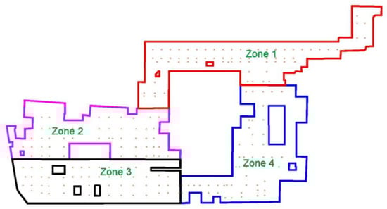 This thesis work focuses on a case study of a mall car park located in Tabriz, Iran, with a total area of approximately 21,670 . The capacity of the car park is 450 vehicles. The enclosed area has a height of 3 m. The car park is divided into four separate zones, as illustrated in Figure 2. Each subdivision of the car park has the following resulting areas: