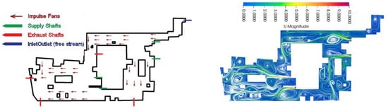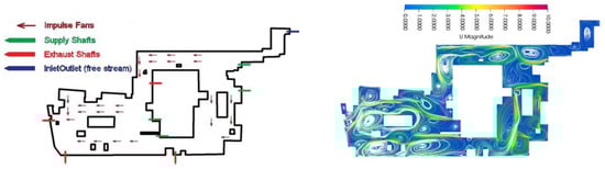 Figure 4 (left) showcases the results of simulations for the base case placement of jet fans. These jet fans are assumed to operate in high-speed mode, generating an outlet air velocity of 22.3 . As illustrated in Figure 4 (right), this design yields satisfactory airflow from the supply to the exhaust points. However, certain areas in zones 1, 3, and 4 experience stagnation points where the airflow nearly ceases, posing a risk of smoke concentration in those regions. It is important to note that all subsequent visualizations represent slices taken at a height of 1.7 , which is considered the average human height.