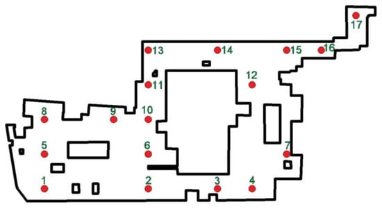 In order to examine the impact of fire source location, a total of 17 distinct scenarios were investigated. The fire scenarios were determined by starting from the initial location and extending in all directions. However, due to computational constraints, certain fire locations had to be omitted from the study. Figure 5 depicts the 17 selected fire source location scenarios, providing a visual representation of the varied positions considered.
