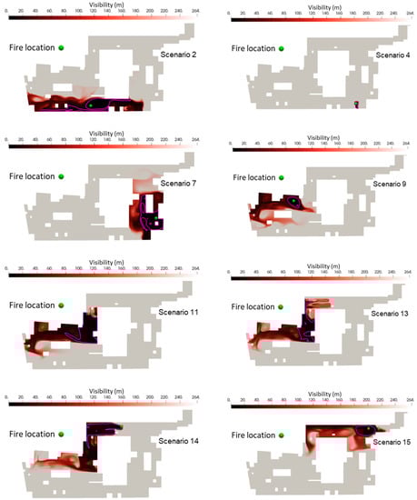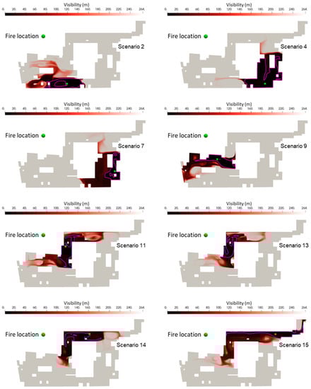 Figure 6 illustrates the distribution of visibility for the eight worst-case scenarios (i.e., scenarios 2, 4, 7, 9, 11, 13, 14, and 15), presenting a visual representation of how visibility is affected in each scenario. Appendix A contains the remaining figures for further exploration. Contours are set to the value of in all visibility fields to show the capability of the ventilation system in maintaining a clear path for the firefighters to reach to the firebase by .