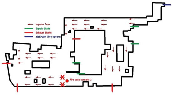 To conduct a more detailed analysis of fire Scenario 2, which is considered the most challenging in terms of smoke dispersion, further investigations are carried out for the proposed fan setup. In this analysis, it is assumed that two jet fans adjacent to the fire source become non-operational due to excessive heat, as depicted in Figure 9. By replicating the simulations under these specific conditions, the resulting visibility field is obtained and presented in Figure 10. The findings clearly demonstrate that the smoke dispersion is significantly extended towards Zone 4, indicating the potential risks associated with impaired jet fan operation during fire incidents. This outcome highlights the critical importance of utilizing fire-resistant fans equipped with fireproof electromotors and ensuring their regular maintenance. By employing such measures, the operation of jet fans can be ensured even under extreme circumstances.
