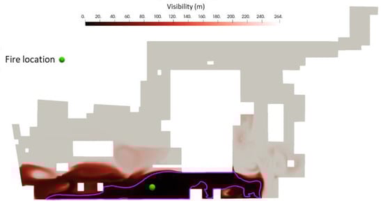 Visibility distribution for the proposed fan positioning, when two fans adjacent to the fire source in Scenario 2 are non-operational.