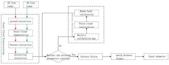 In this paper, the point cloud data from two laser radars undergo preprocessing and feature extraction, enabling real-time calibration of external parameters among multiple laser radars. When non-convergence of external parameters is detected, the feature point cloud from the main lidar is utilized for inter-frame matching to solve the laser odometer information [26,27,28]. Concurrently, online calibration is performed to unify the coordinate systems across multiple radars and vehicles. Upon detecting the convergence of external parameters, a fusion strategy proposed in this paper is employed, merging feature point clouds from the two radars to solve the laser odometer. The specific process is illustrated in Figure 1.