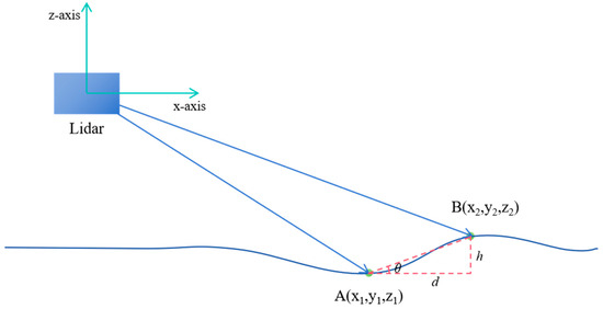 Ground point cloud screening, as depicted in Figure 2, involves two points, A and B, scanned by two adjacent laser beams on the same column. In the figure, h indicates the height difference between the points, d is the horizontal distance, and θ represents the angle between the straight line formed by the points and the horizontal plane. The determination of whether points A and B belong to the ground point cloud hinges on comparing the horizontal angle with a predetermined threshold. If it surpasses the threshold, both points are considered non-ground. Otherwise, both points are considered as part of the ground point cloud.