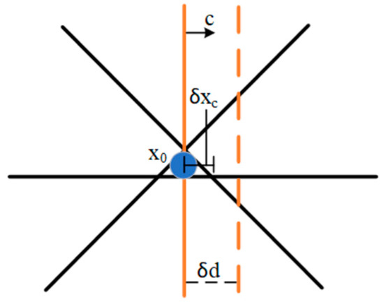 In Figure 4, the black line represents the plane constraint, the orange line denotes the additional hyperplane constraint, the blue point x0 represents the optimization problem’s solution, c is the normal vector of the additional hyperplane constraint with a modulus length of 1, δd denotes the offset distance of the hyperplane after adding the disturbance, and δxc is the offset distance of the constraint, i.e., the offset distance of x0 after adding the disturbance. The derivation of the degradation factor can be obtained. Since the constraint intersects with x0, the latter is not altered by the additional constraint, resulting in the following equation: