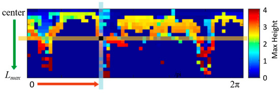 By segmenting the point cloud into rings and using a small sector for finer division, distinct indexed regions can be located within the two-dimensional feature map. The feature map’s values correspond to the highest reflection point’s elevation in the respective area. This approach extracts a two-dimensional feature map while retaining the spatial structural characteristics of the point cloud, as exemplified in Figure 6.