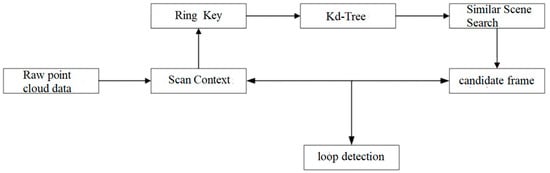 Given that ring characteristics are unaffected by the vehicle’s orientation, the ring key becomes rotation insensitive. While it contains less information compared to the complete Scan Context descriptor, it enhances candidate frame searching efficiency. By constructing a Kd-tree and selecting the Scan Context corresponding to the multiple historical ring keys most similar to the ring key of the current scene, the nearest scene can be identified using the distance calculation formula described in the preceding section. This entire scene recognition process is depicted in Figure 7.