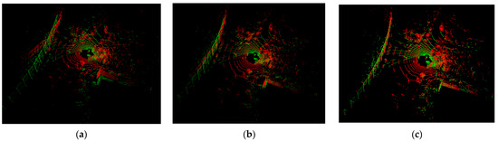 Upon analyzing Table 2, it is deduced that the maximum translation error of the online calibration algorithm is 0.0617705 m, and the maximum rotation error is 1.497818°, both falling within acceptable limits. The smaller deviation in translation calibration results can be attributed to the precision of actual translation measurements as well as minimal translation deviation between the two lidars, rendering this paper’s algorithm more capable of achieving accurate calibration results. Notably, the yaw angle exhibits greater deviation among the three rotation angles, primarily due to the lidar’s relatively low vertical resolution and limited vertical direction constraints.