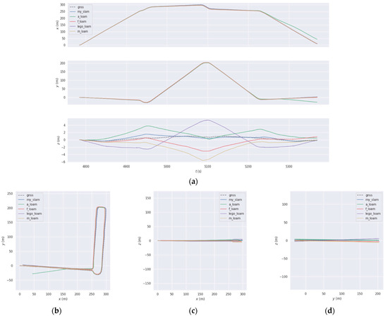 Comparison of trajectories of various laser SLAM algorithms with GPS trajectories. (a) Comparison of trajectories on different axes for various laser SLAM algorithms; (b) trajectory in the xy plane; (c) trajectory in the xz plane; and (d) trajectory in the yz plane.