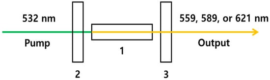 The optical scheme of the external-cavity Raman laser is shown in Figure 2. The laser included a 7 × 7 × 50 mm “NP”-cut KGW crystal from Eksma Optics, with two flat mirrors: a pump and an output. The pump mirror had 93–95% transmission at 532 nm and 99.5% reflection within 550–670 nm. The output mirror had 99.5% reflection at 532 nm, to produce double-pass pumping. The reflection coefficients of the output mirrors at other wavelengths were varied, to determine the optimum values to selectively generate the first, second, or third Stokes order. Both mirrors were placed close to the ends of the KGW crystal, so the resonator length was 52–54 mm.